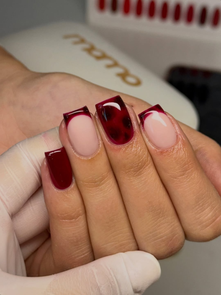 This look combines deep burgundy tones with chic tortoise shell accents. The mix of glossy square tips and a bold tortoise feature nail makes it both classy and fashion-forward.