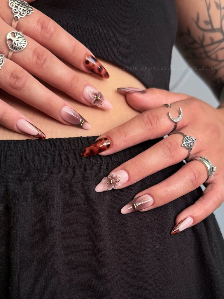 Go for medium almond nails with the traditional mix of amber and dark brown swirls. It’s polished, stylish, and works for both everyday wear and special occasions.