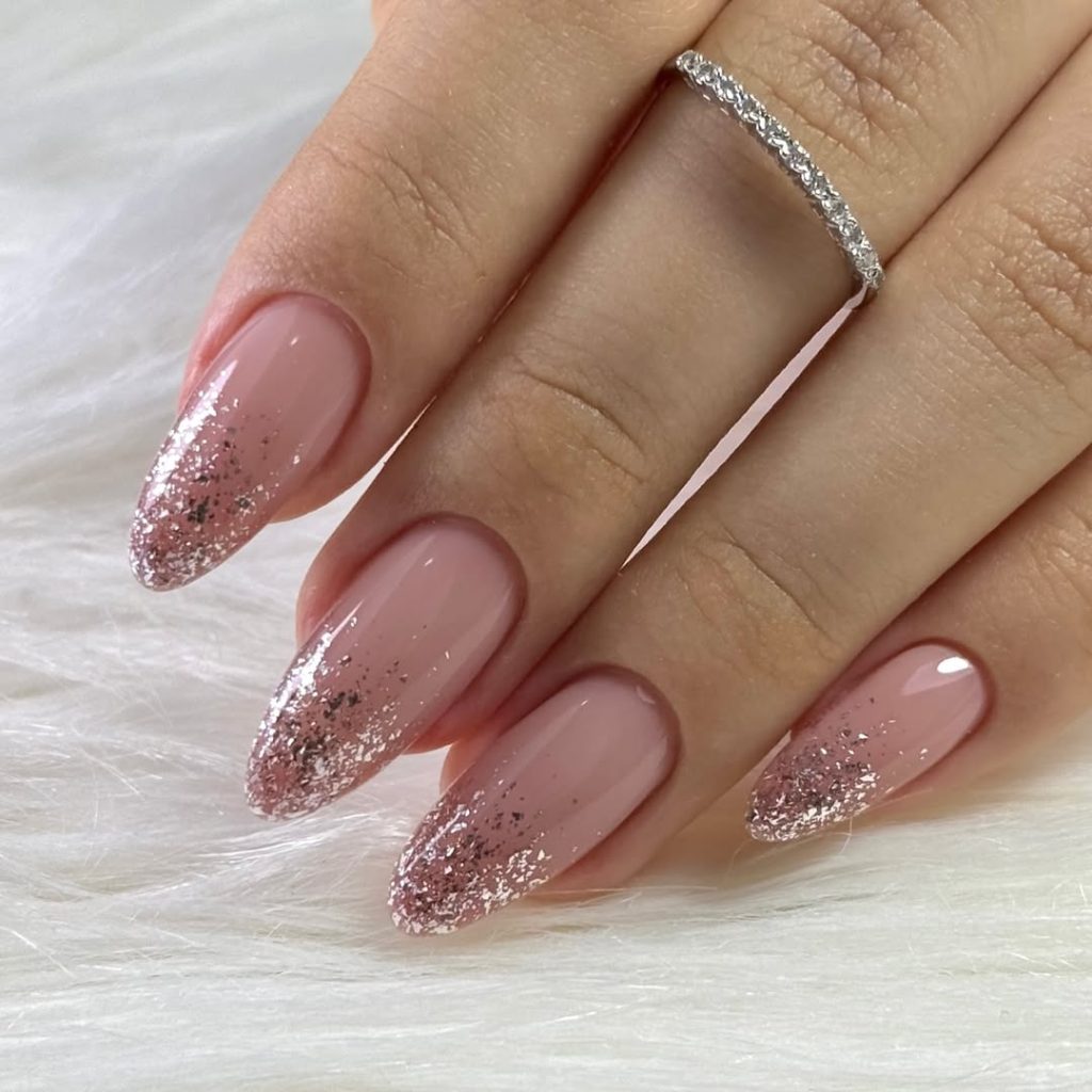A nude or pink base with glitter concentrated at the cuticle or tips creates a soft sparkle effect.