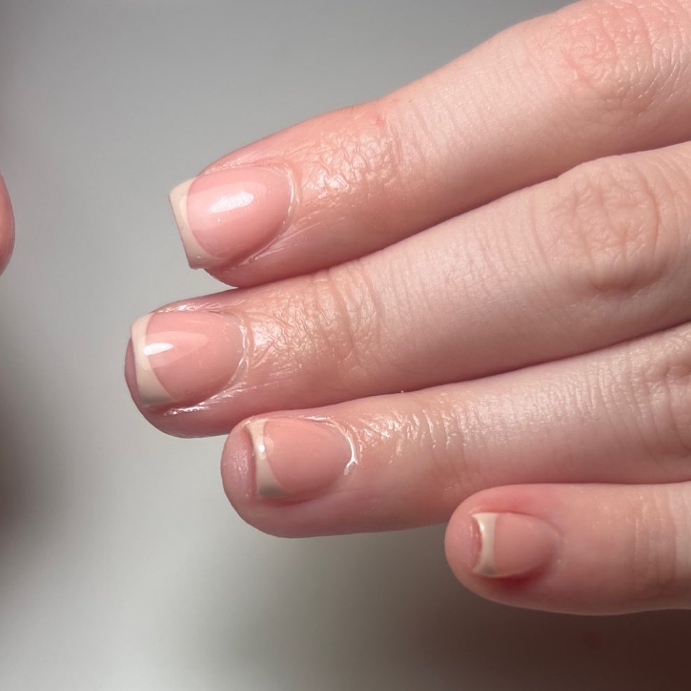 Tiny French tips on short nails, a dainty and playful take on minimal nail design that still feels refined.