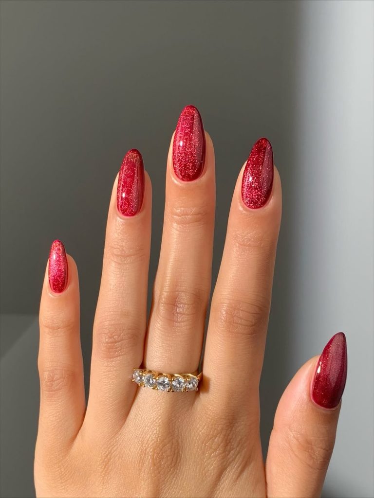 Velvet-effect polish gives red nails a soft shimmering glow. On almond nails, the effect looks rich and dramatic. The color shifts slightly in different lighting, making the manicure feel dynamic. It’s classic red but with a glamorous twist.